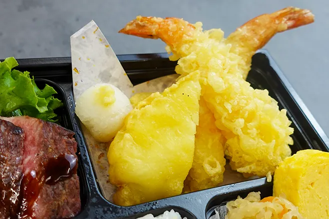 〜四季折々の厳選食材を、職人の確かな技で仕立てた天ぷらと日本料理の調和〜 衣は軽やかに、海老や旬野菜の天ぷらを香り高く揚げ上げ、上品な味わいを閉じ込めました。 副菜には、出汁の旨みが効いた煮物や惣菜、ふっくら艶やかな御飯を添えております。 一つひとつ丁寧に仕上げたお料理は、見た目にも美味しい逸品です。 上質な日本料理をお弁当でお手軽にお愉しみください。