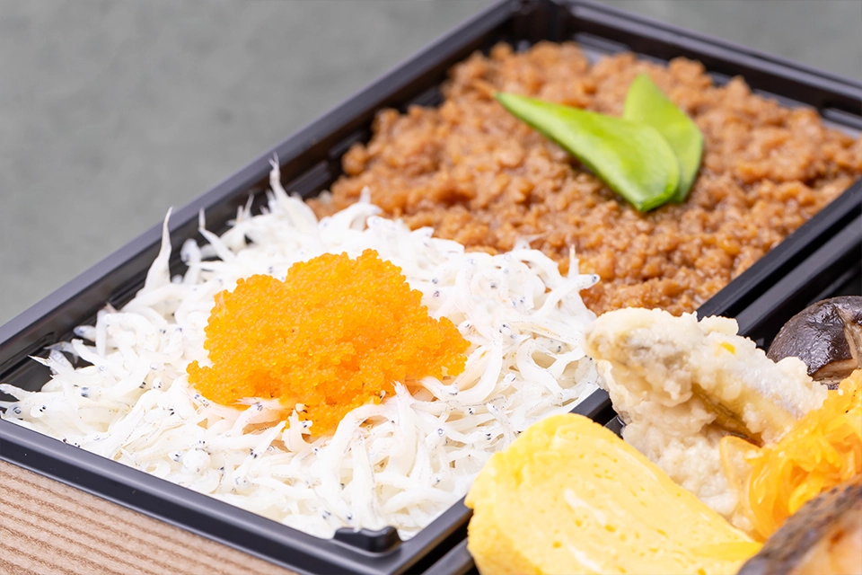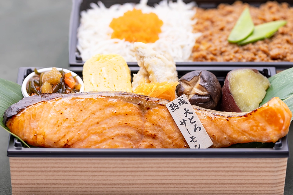 | お品書き | <壱の重> 熟成 大とろサーモン若狭麹焼き 数の子の松前風 ワカサギの南蛮漬け たまごやき 季節の煮物 <弐の重> しらすご飯 そぼろめし お茶PET500ml |