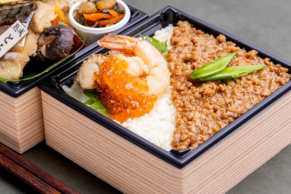 | お品書き | <壱の重> 熟成 とろさば若狭麹焼き 数の子の松前風 ワカサギの南蛮漬け たまごやき 季節の煮物 <弐の重> 蟹いくら海鮮めし そぼろめし お茶PET500ml |