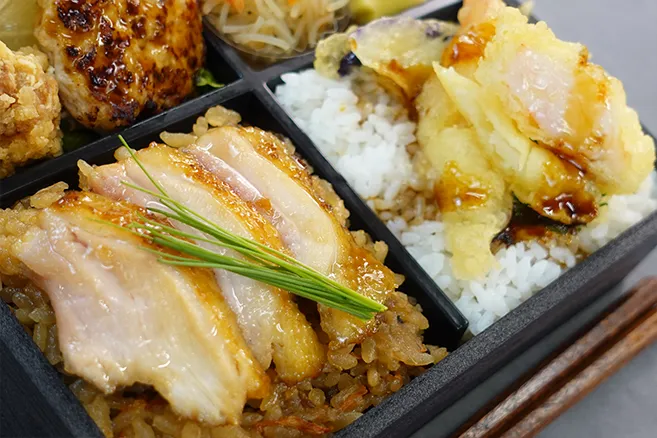 地鶏本来の噛みしめるたびに広がる旨みをお愉しみいただけるよう3種の鶏料理に加え、海老天重や季節のお惣菜をぎっちり詰め込みました。