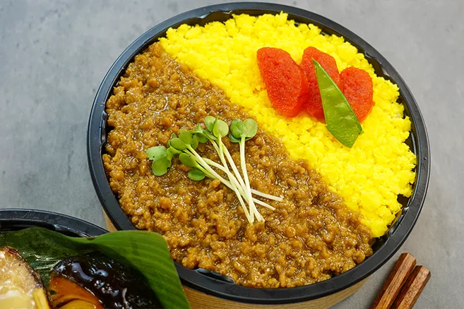ご飯にはそぼろ煮、明太子と出汁玉子をのせて、二段重に仕立てています。