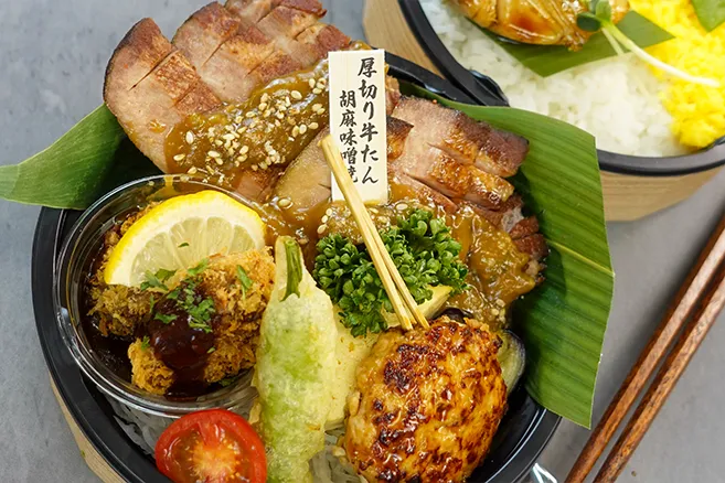 お品書き | <壱ノ重> 厚切り牛たん 吟醸胡麻噌焼き 和風つくね照焼き 鶏とろ肝のフライ 玉子焼き、そうざい <弐ノ重> 銀だら幽庵焼き 明太子・出汁玉子ご飯 お茶PET500ml |