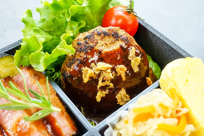 特製ソースと旬の副菜を添えたお弁当は、見た目にも華やか。素材と技が織りなす格別の一品へ仕上がりました。