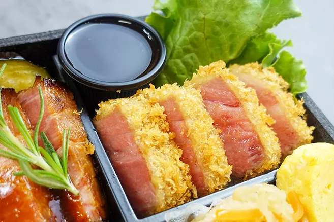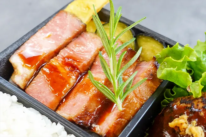 特製ソースと旬の副菜を添えたお弁当は、見た目にも華やか。素材と技が織りなす格別の一品へ仕上がりました。