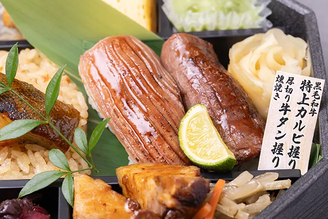 | お品書き | 黒毛和牛握り 厚切り牛たん握り 銀鱈幽庵焼き 合鴨ネギ南蛮 旬魚と茄子の味噌和え 豚角煮 惣菜 五目炊き込みご飯 香の物 お茶PET500ml |
