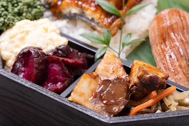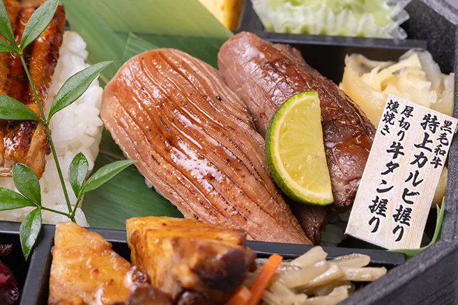 | お品書き | 黒毛和牛握り 厚切り牛たん握り うなぎ蒲焼 合鴨ネギ南蛮 旬魚と茄子の味噌和え つくね 豚角煮 惣菜 ご飯 香の物 お茶PET500ml |