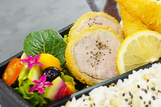 | お品書き | 彩り野菜と果物のサラダ 玉子のツナソース 魚の南蛮漬け きんぴらごぼう 熟成ポーク へれかつ 特製ソース 海老フライ タルタルソース 麦ごはん 山芋とろろ 香の物 お茶PET500ml |