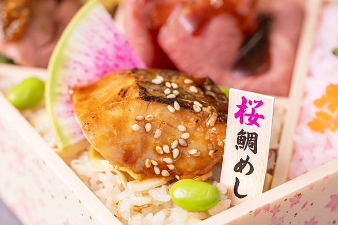 ご飯は趣の異なる2種で仕立て上げます。高級魚・桜真鯛と新筍の香りが芳醇な桜鯛めしに、春爛漫に仕上げた桜ちらし。さらに京出汁の炊き合わせや茶碗蒸しなど、全てにおいてこだわり抜きました。まさに春爛漫。豪華食材をぎっしり盛り込んでいます。