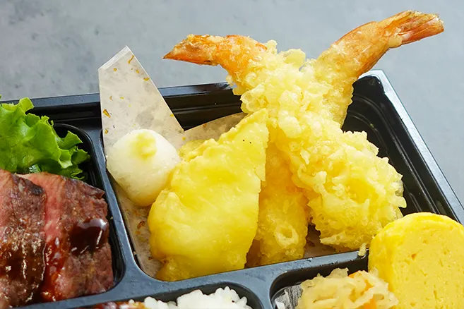 〜四季折々の厳選食材を、職人の確かな技で仕立てた天ぷらと日本料理の調和〜 衣は軽やかに、海老や旬野菜の天ぷらを香り高く揚げ上げ、上品な味わいを閉じ込めました。 副菜には、出汁の旨みが効いた煮物や惣菜、ふっくら艶やかな御飯を添えております。 一つひとつ丁寧に仕上げたお料理は、見た目にも美味しい逸品です。 上質な日本料理をお弁当でお手軽にお愉しみください。