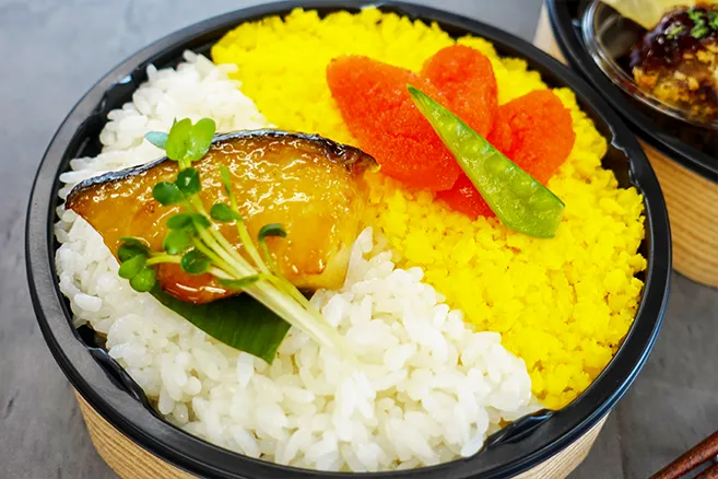 ご飯には銀だらの幽庵焼き、明太子と出汁玉子をのせて、二段重に仕立てています。