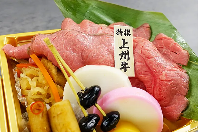 | お品書き | 謹製 宝珠海鮮重 ・とろサーモン・海老・胡瓜 ・炙り真鯛・穴子・紅芯大根 ・新芽・飛子・蓮根・特製酢飯 群馬県産 上州牛のロースト 新春の祝肴 ・黒豆祝煮・栗の甘露煮 ・たたき牛蒡・紅白蒲鉾・惣菜 薬味 ・九州醤油 母ゆずり ・生わさび お茶PET500ml |