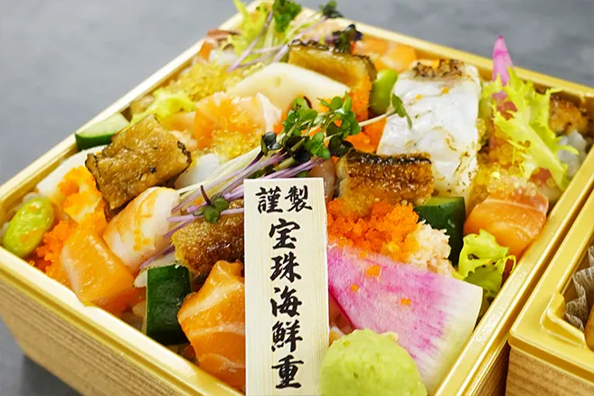 壱の重は真鯛、サーモン、穴子、海老など豪華絢爛10種以上の旬食材を使用した謹製 海鮮重をご用意いたしました。