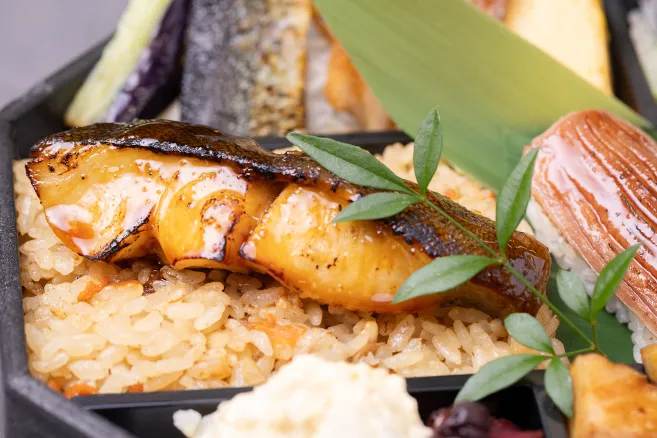 | お品書き | 黒毛和牛握り 厚切り牛たん握り 銀鱈幽庵焼き 合鴨ネギ南蛮 旬魚と茄子の味噌和え 豚角煮 惣菜 五目炊き込みご飯 香の物 お茶PET500ml |