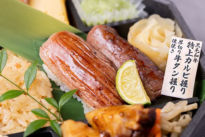 黒毛和牛カルビ・厚切り牛たんで仕立てた2種握りと五目炊き込みご飯を盛り込みました。