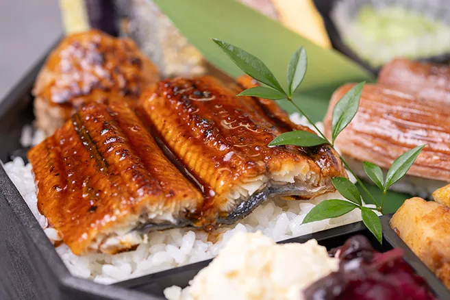 | お品書き | 黒毛和牛握り 厚切り牛たん握り うなぎ蒲焼 合鴨ネギ南蛮 旬魚と茄子の味噌和え つくね 豚角煮 惣菜 ご飯 香の物 お茶PET500ml |