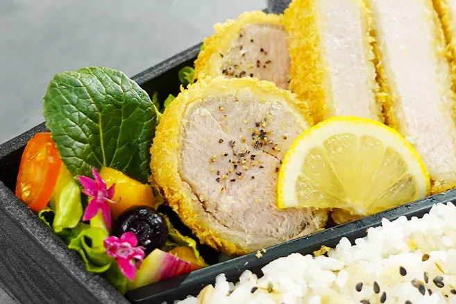 | お品書き | 彩り野菜と果物のサラダ 玉子のツナソース 魚の南蛮漬け きんぴらごぼう 熟成ポーク へれかつ 熟成ポーク ロースカツ 特製ソース 麦ごはん 山芋とろろ 香の物 お茶PET500ml |