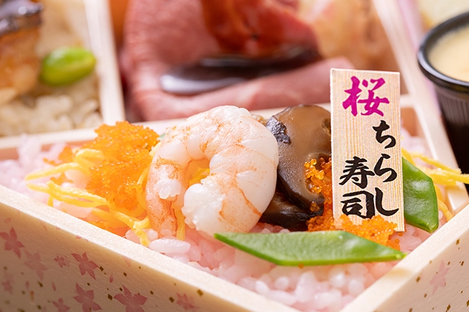 ご飯は趣の異なる2種で仕立て上げます。高級魚・桜真鯛と新筍の香りが芳醇な桜鯛めしに、春爛漫に仕上げた桜ちらし。さらに京出汁の炊き合わせや茶碗蒸しなど、全てにおいてこだわり抜きました。まさに春爛漫。豪華食材をぎっしり盛り込んでいます。