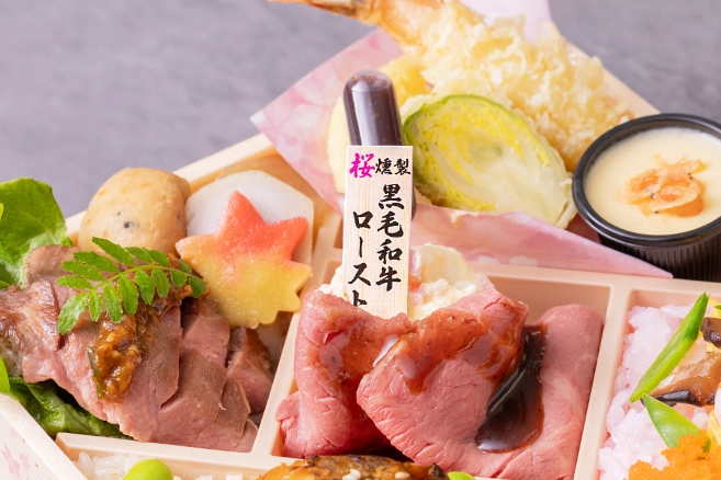 | お品書き | 陽春の炊合せ サクラ咲くじゃがいもサラダ 桜海老の茶碗蒸し 豚芯タンの燻し焼き 〜ねぎ味噌仕立て〜 天ぷら盛り合わせ 〜大海老、芽キャベツ、蓮根、梅塩〜 桜燻製 黒毛和牛ローストビーフ 〜和風赤ワインそうす〜 桜鯛めし 〜桜真鯛と新筍〜 春爛漫 桜ちらし寿司 お茶PET500ml |