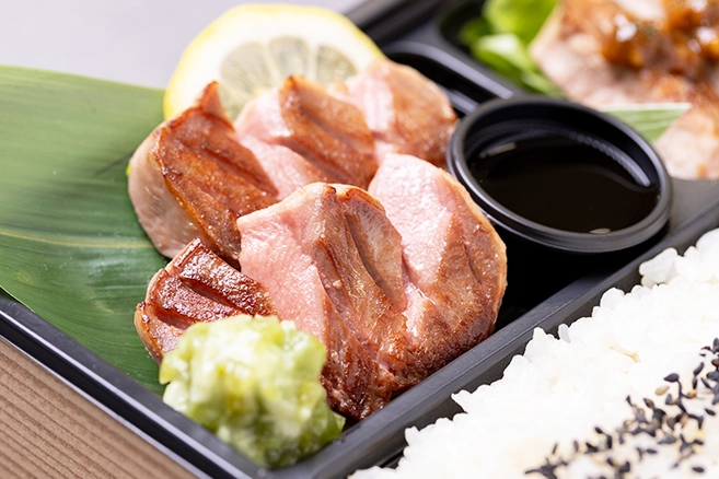 | お品書き | 厚切り豚芯タン 〜仙台燻焼き〜 厳選ポークステーキ 〜ネギ味噌だれ〜 出汁とろろ 玉子焼き きんぴらごぼう 漬物 刻み山葵 特製醤油だれ ご飯 お茶PET500ml |