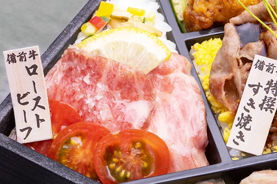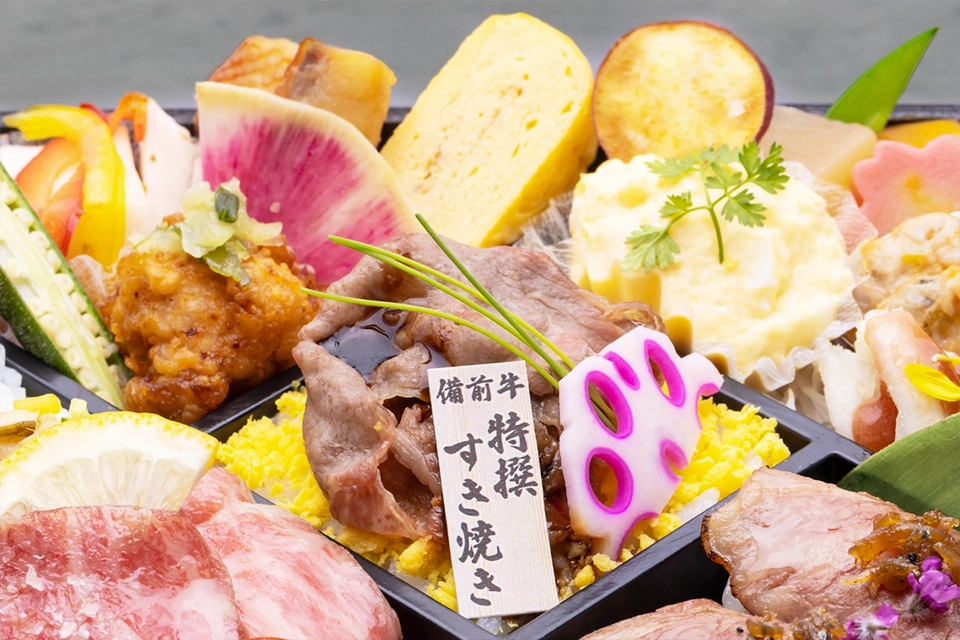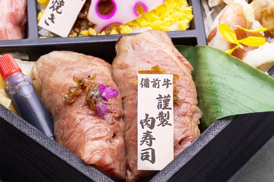 | お品書き | 希少 おかやま備前牛 ・謹製 肉寿司 ・特撰 すき焼き重 ・ローストビーフちらし 赤魚の煮付け 鶏肉の葱そうす 自家製ぽてとさらだ 浅利の生姜和え 白魚の梅菊仕立て 季節のおばんざい 大根彩り漬 PREMIUM 緑茶 PET500ml |